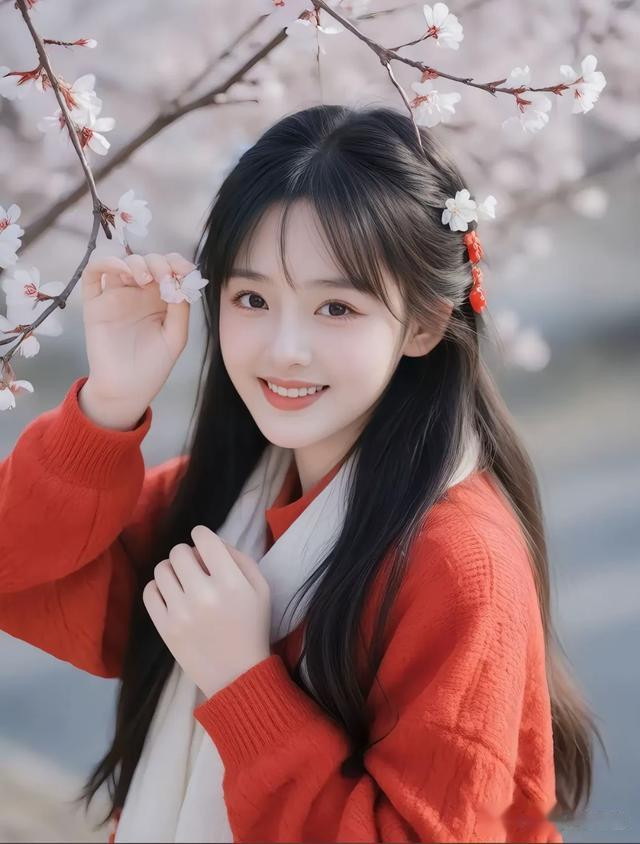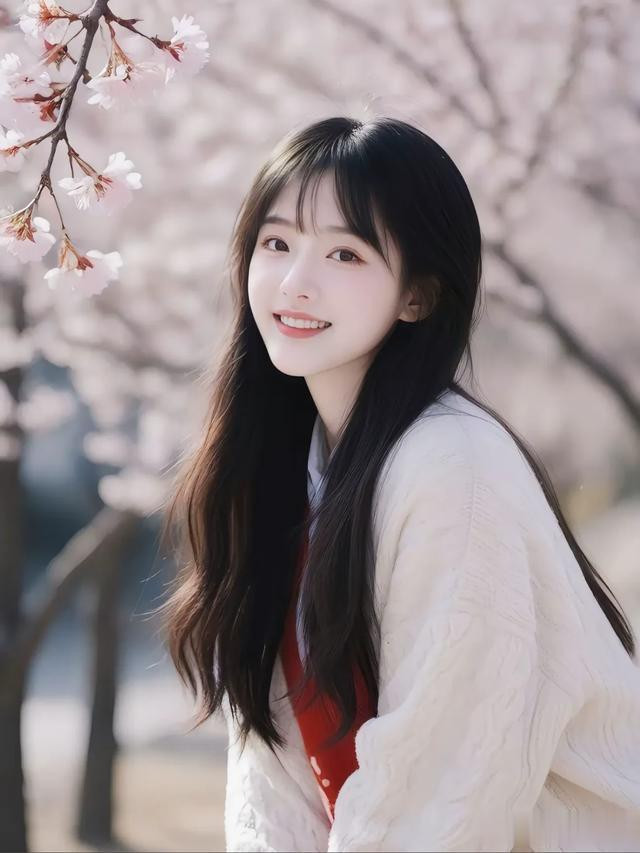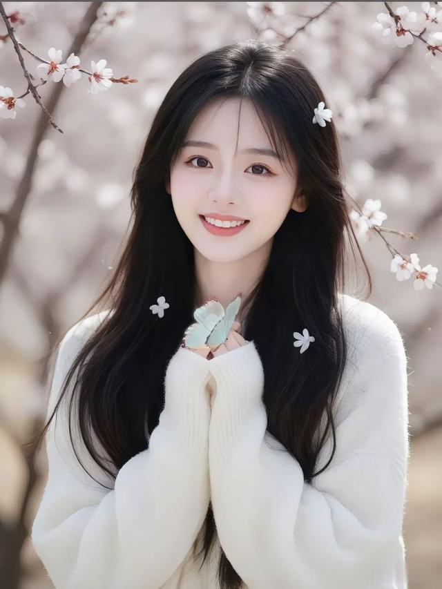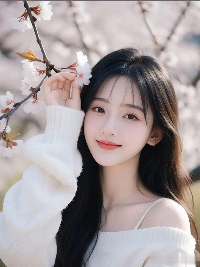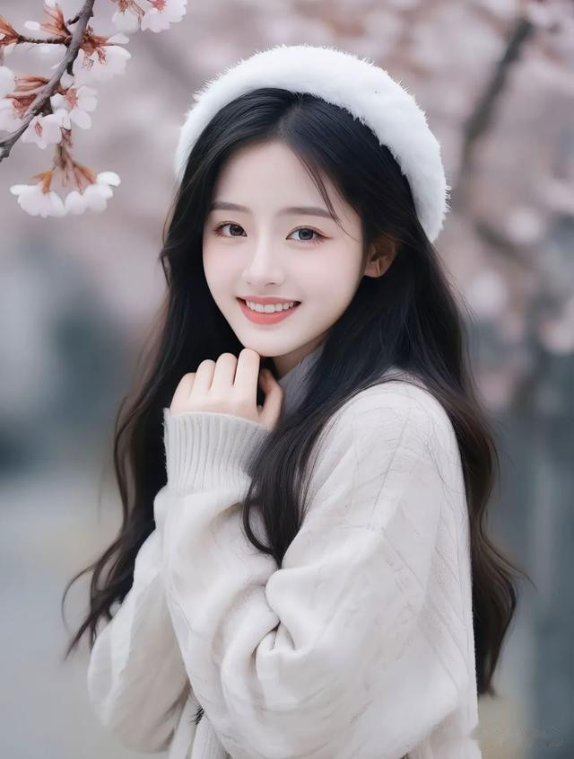 一袭简约的白色毛衣,衬出她的温柔纯净。乌黑长发自然垂落,发丝间点缀着飘落的花瓣,恰似从梦幻中走来。